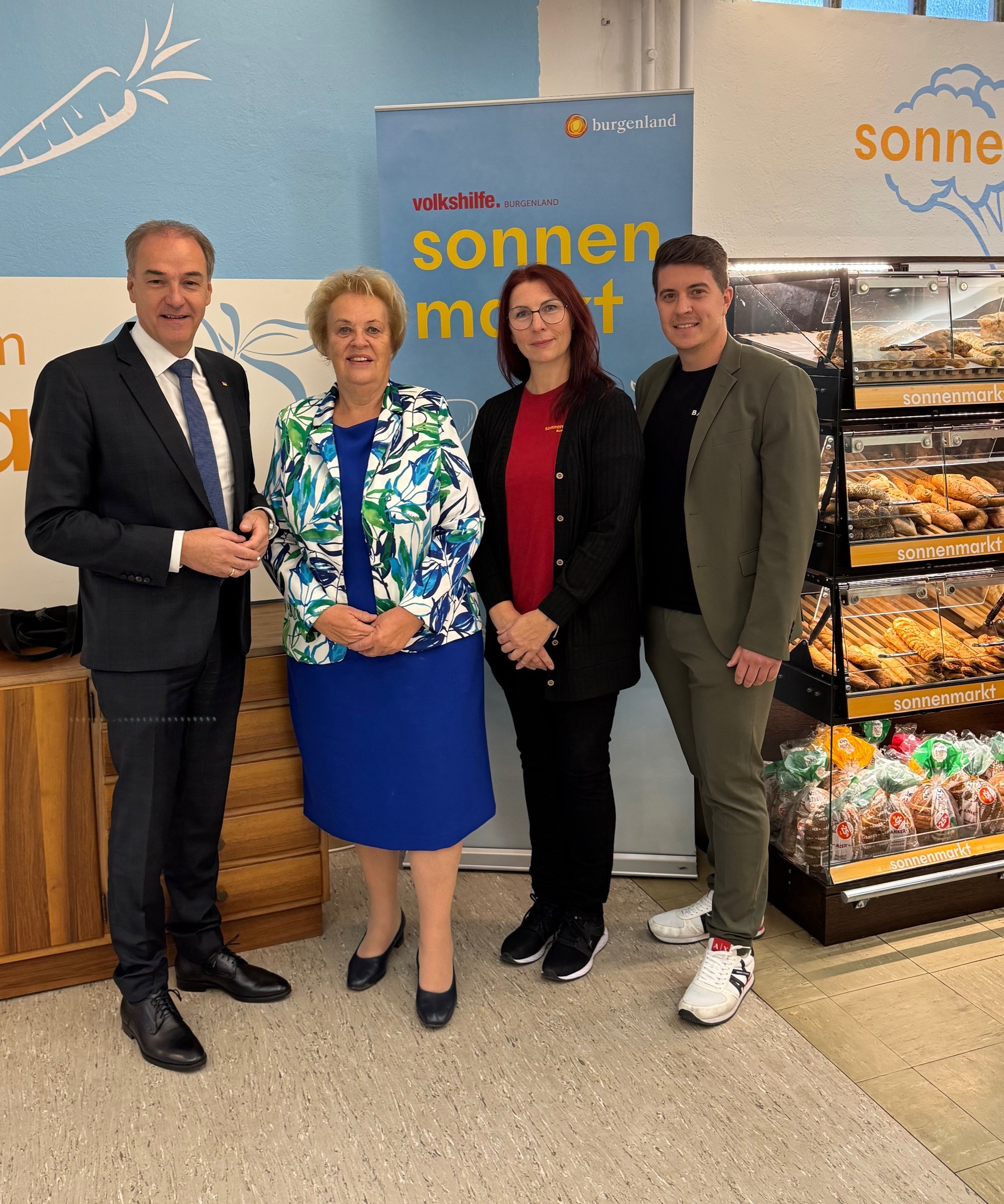 Bildbeschreibung von links: Landesrat Leonhard Schneemann, Präsidentin der Volkshilfe Burgenland Verena Dunst, Marktleiterin Susanna Weidinger und stellvertretender Geschäftsführer Patrick Gober